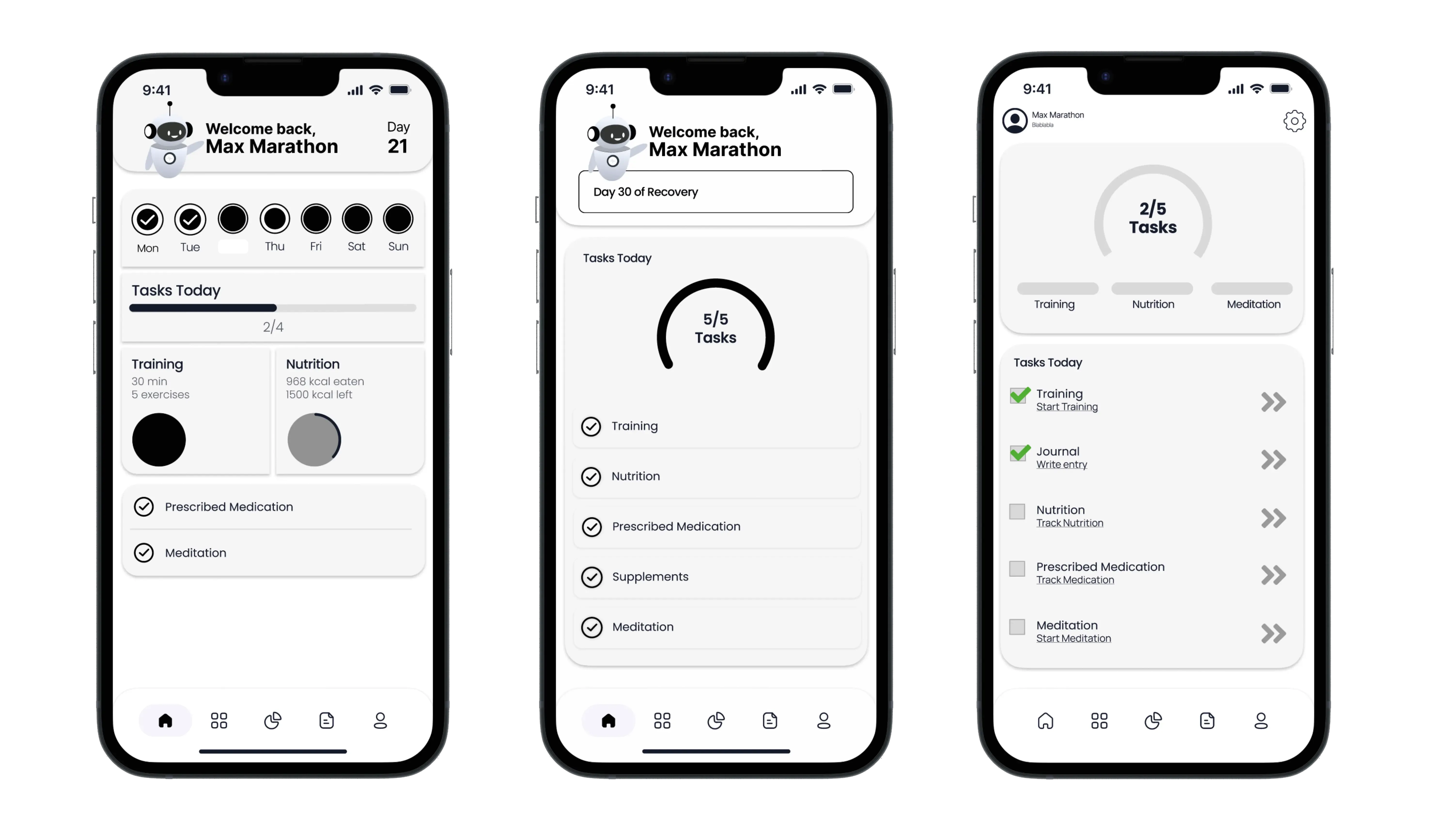 Our design phase led us to develop two specialized interfaces: a mobile view for the patient and a desktop view for the therapist. Each presents a unique design challenge - the therapist’s view centers on concisely presenting nuanced information without an intricate navigation system, incorporating multiple information-rich dashboards with graphical data representation capability. In contrast, the patient’s interface prioritizes motivational features, aiming for an attractive presentation of the user’s progress towards their rehabilitation.